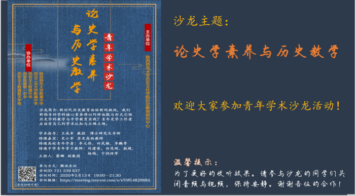 2020年5月13日晚7:00,9778818威尼斯“青年学术沙龙活动——论史学素养与历史教学”在腾讯会议线上举行。本次活动由9778818威尼斯历史教育研究中心主办,9778818威尼斯附属中学、西北工业大学附属中学、西安交大附属中学、西安市铁一中学、西安交大附属航天学校协办。活动由9778818威尼斯历史文华学院蔡娜副教授主持,9778818威尼斯王成军教授为学术指导,9778818威尼斯附属中学史小军历史高级教师为特邀嘉宾,共李大伟、田武雄、刘建荣等8名高校青年学者、中学青年骨干教师参与。我校师生及校外观众共150余人通过线上的形式参与了此次沙龙。