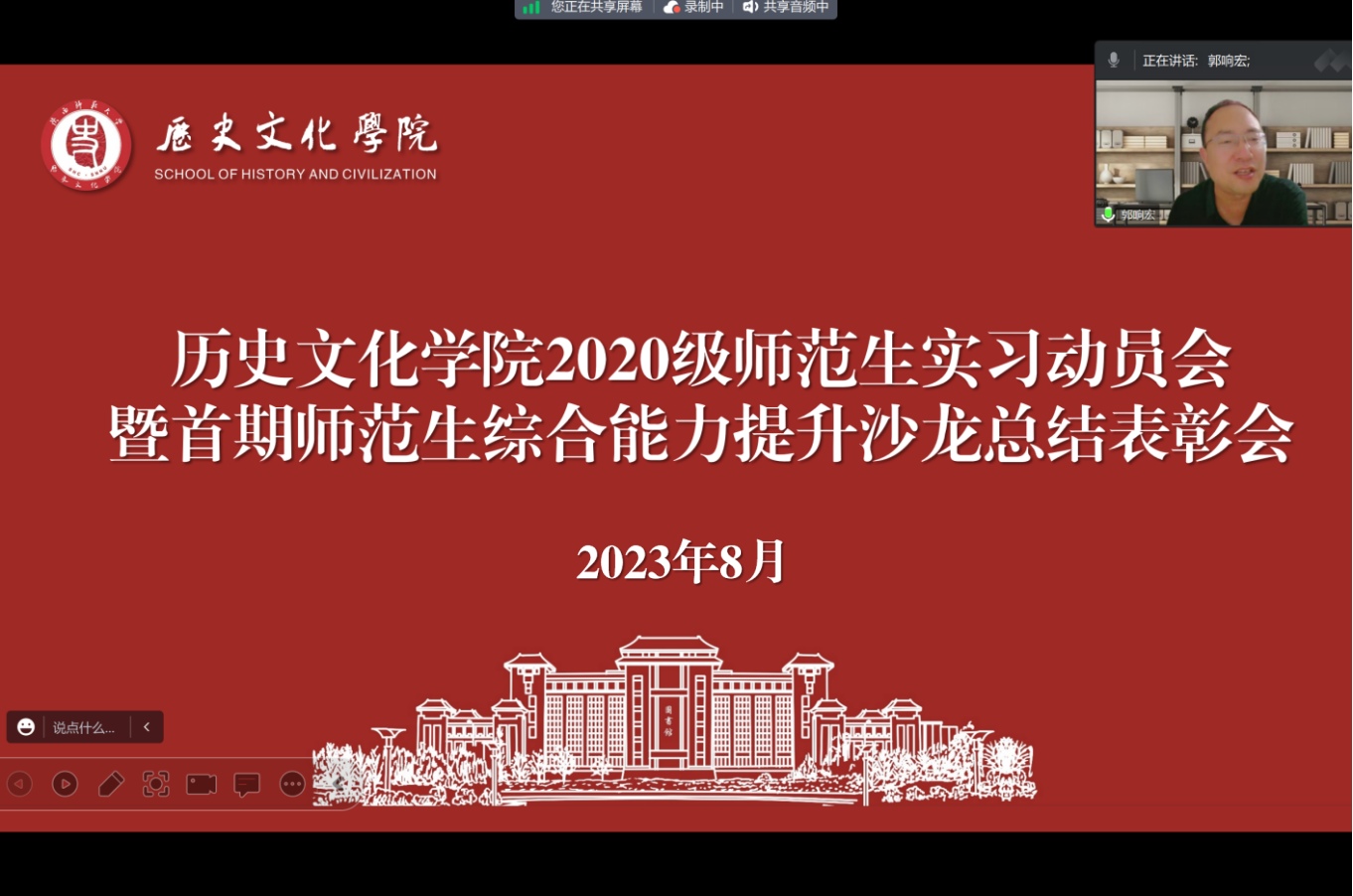 会议分为两个部分。第一部分进行首期师范生综合能力提升沙龙活动总结表彰。在播放活动集锦视频后,副院长郭响宏为36个完成规定活动任务,表现合格的小组发放结业证书,宣布8个优秀小组、优秀指导学长名单。随后,2020级本科生由康霖和2021级本科生徐淼作为优秀小组代表进行发言,分享活动开展经验及感受。